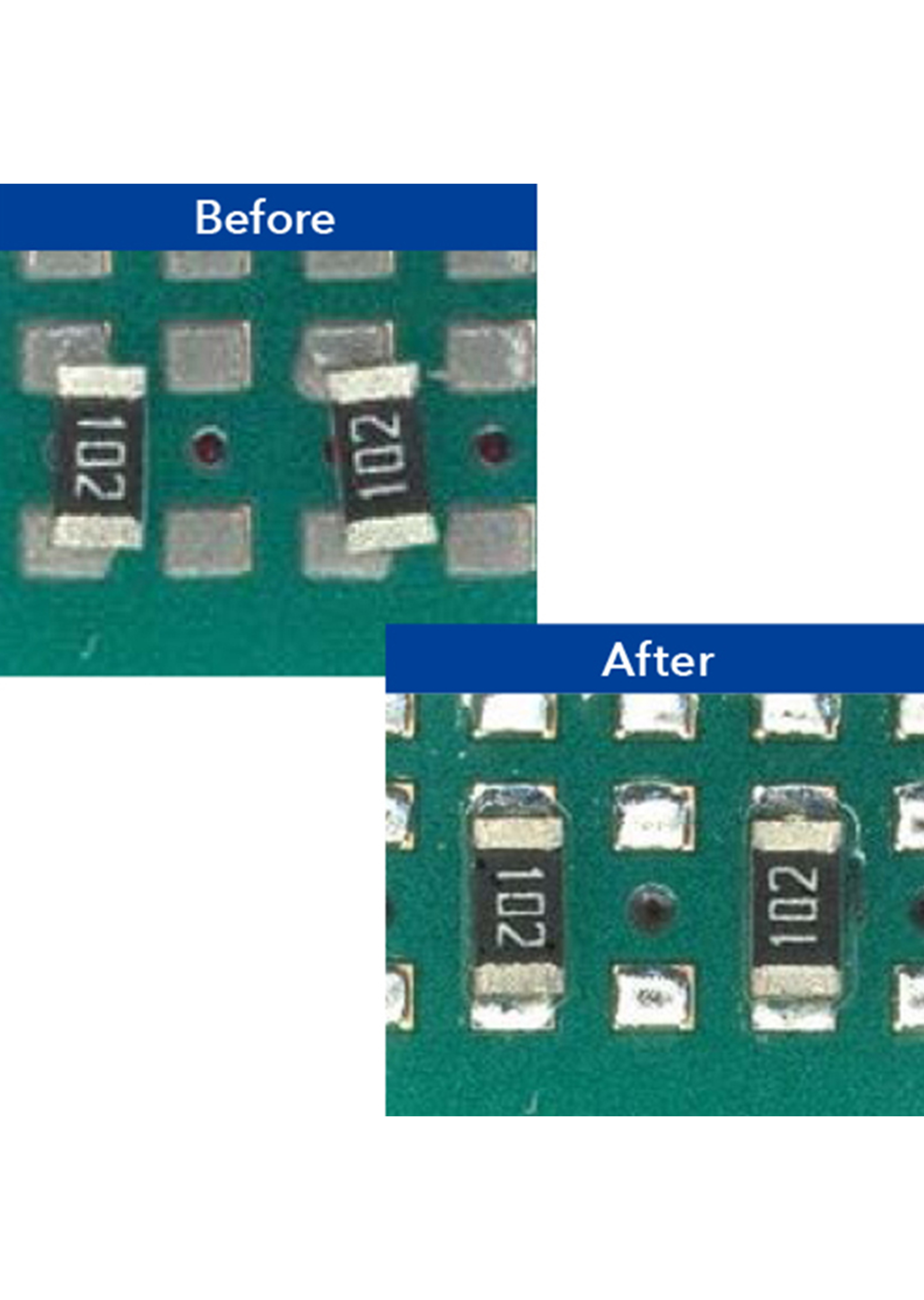 Low curing temperature mitigates damage to the PCB and the components. JU-90LT-3 cures at low temperatures around 90-100℃, reducing the level of oxidation for the components and substrate. It enables improvement in the overall product quality and first time product quality.